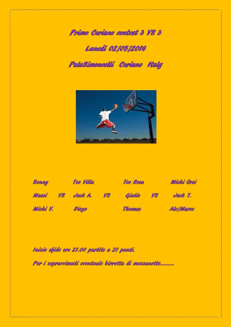 Grande evento andato in scena Ieri sera al PalaSic di Coriano, TUTTI PRESENTI (un saluti a Chadi assente giustificato) per il primo contest 3 VS 3 made in Coriano, piccolo cambio di formazione dovuto ai capricci di Giulio e Teo Rosa che se non gli davamo Michi Orsi, si sarebbero messi a piangere......